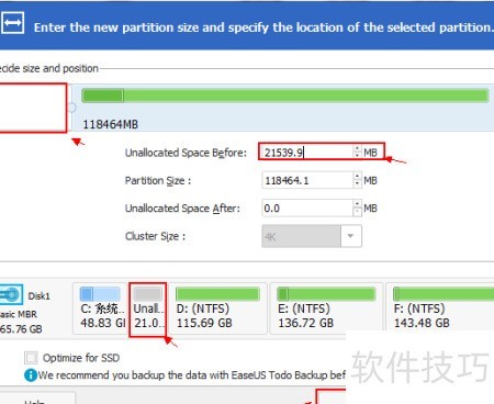 7、 下方横条显示D盘容量,向右拖动可调整大小,框内数值同步变化,系统将自动创建新分区。此处释放21GB空间,核对信息无误后,点击确定完成操作。