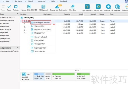 8、 右键点击C盘,选择调整/移动分区即可进行操作。