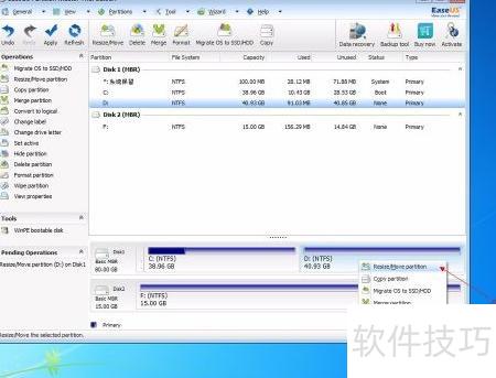 4、 启动软件后,右键点击D盘驱动器,选择菜单中的调整/移动分区功能进行大小修改。