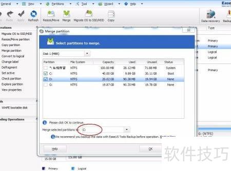 8、 勾选D盘,保持默认合并至C盘设置,点击确定后选择应用,后续连续确认即可,软件将自动完成合并并重启系统。