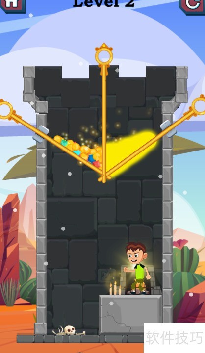 1、 本关仅三插销,需避开熔岩,详情见图示。