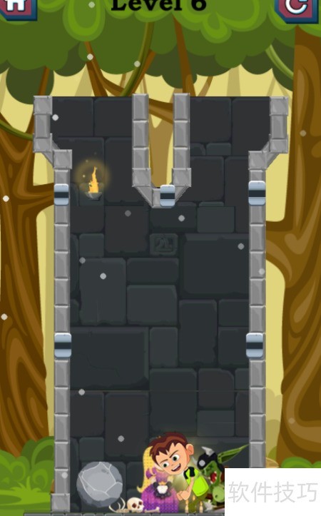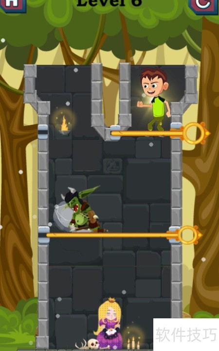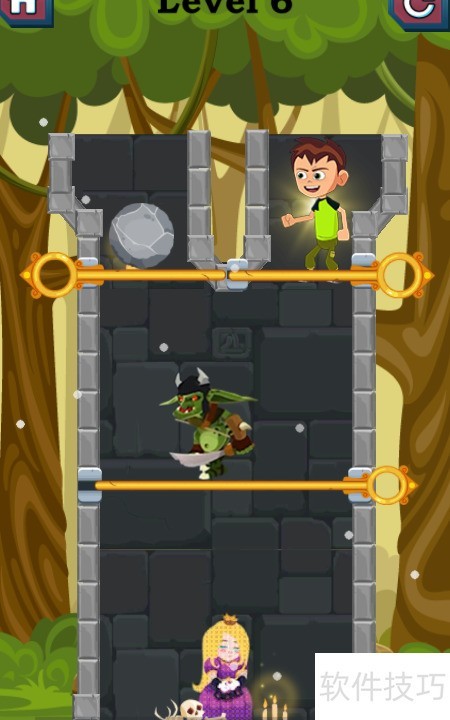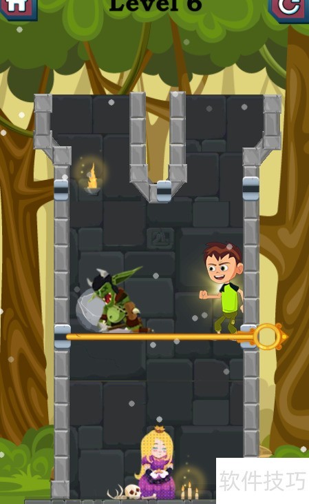1、 本关需解救被困小公主,利用滚石消灭怪物士兵,具体情形见图示。