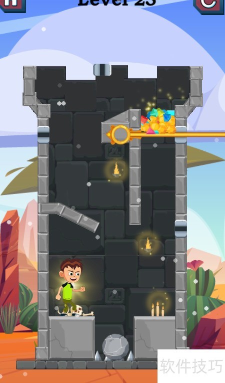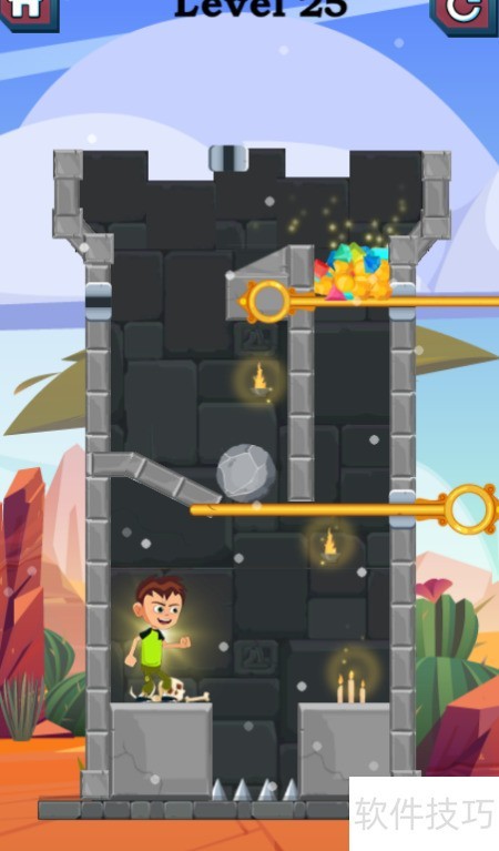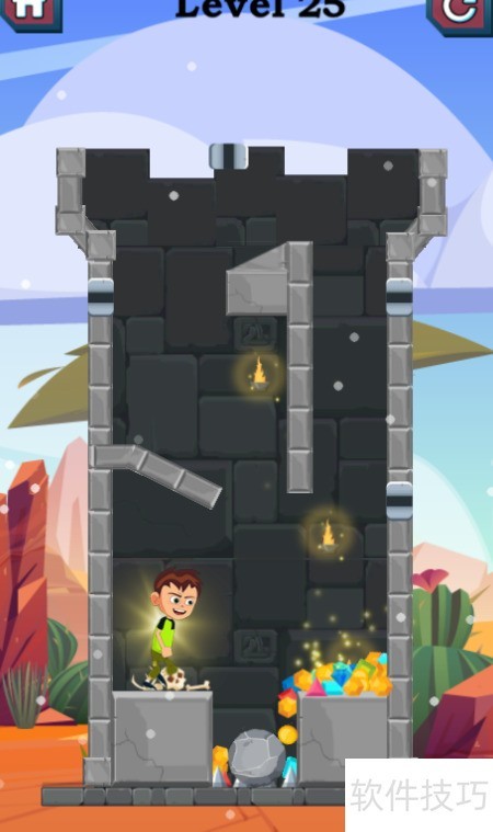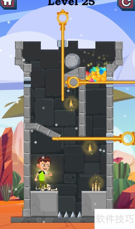 1、 本关需用巨石封住少年右侧陷阱,共有三个插销,具体布局见图示。