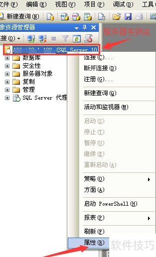 2、 接下来介绍解决上述问题的方法,需调整SQL Server数据库的内存设置。登录数据库后(以SQL Server 2008为例),在界面顶部找到服务器名称,右键单击,于弹出的菜单中选择属性选项,进入相关配置界面进行操作。