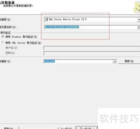 4、 选用SQL Server Native作为数据源,并选定相应数据库。