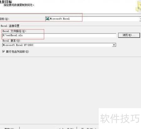 5、 在选择目标页面,将目标设为Excel格式,并指定导出文件的保存路径。