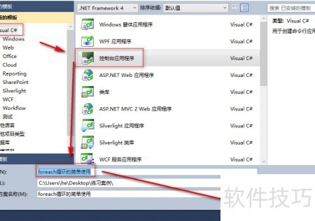 2、 选择控制台应用程序,将其命名为foreach循环的简单使用,然后点击确定完成创建。