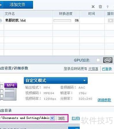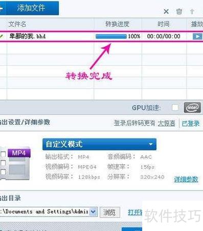 4、 完成视频格式设置后,点击确定返回转码界面,设定输出文件的保存路径,随后点击开始按钮,暴风转码将自动启动,将bhd格式转换为所需的目标视频格式。