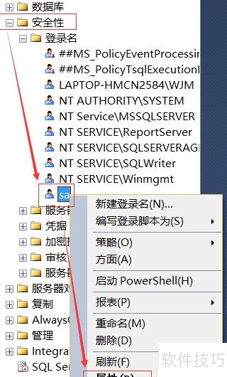 2、 选择SQL Server,右键点击后打开属性设置选项。