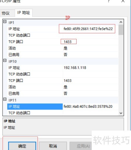 12、 进入SQL Server网络配置,选择MSSQLSERVER协议,双击TCP/IP,切换到IP地址选项卡,正确配置IP地址与TCP端口即可。