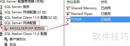 11、 在SQL Server网络配置中,找到MSSQLSERVER协议,将TCP/IP协议设置为启用状态。