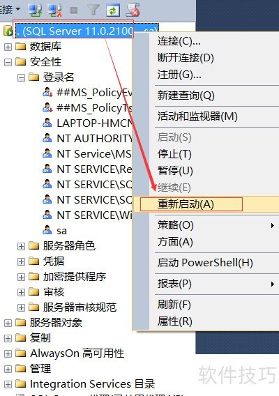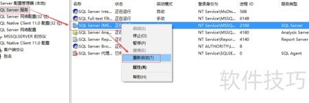 13、 进入SQL Server服务,选择SQL Server并执行重新启动操作。