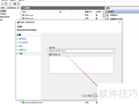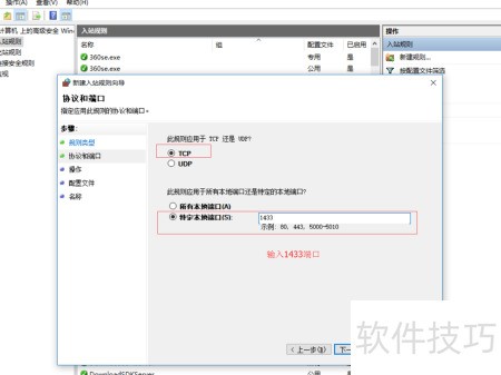 16、 新建入站规则,选择TCP协议,指定本地端口为1433,点击下一步继续配置。