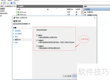 17、 勾选允许连接,点击下一步,全选应用规则的时间选项,再点击下一步。