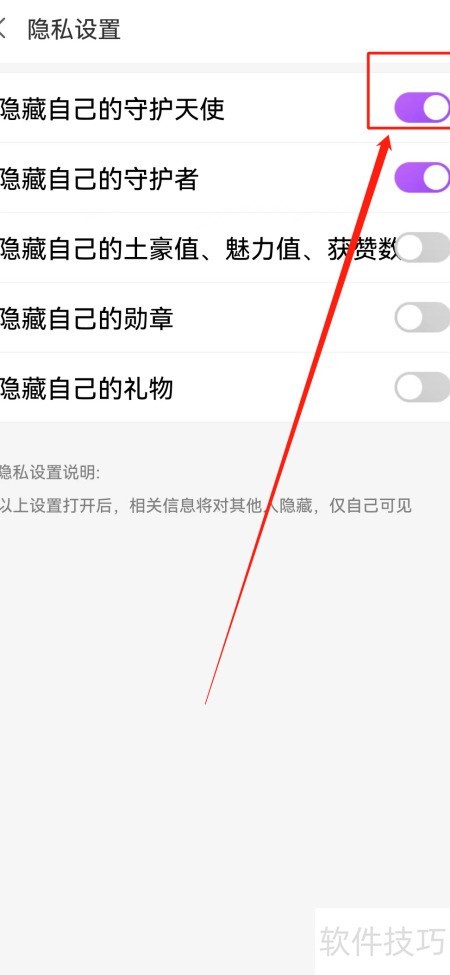 4、 点击隐藏自己的守护天使右侧的圆圈图标,变为紫色即表示操作成功,具体效果所示。