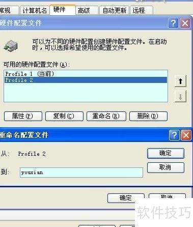 6、 将硬件配置文件重命名为youxian(有线),若未更改则默认为Profile 2,此时中文输入法或不可用,但可正常粘贴操作。