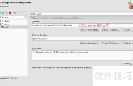 5、 在新建的配置窗口中,先设置javac.exe路径,再于参数栏添加当前工程目录及相关必要参数。
