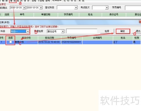 18、 点击按钮,选择考试科目,系统将自动筛选出符合条件的考生。勾选相关人员后,点击确定,系统会自动导入所选学员的信息。