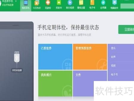 1、 开启手机助手,自动识别本机,轻松管理应用、清理缓存、备份数据。