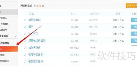 4、 页面左下角会出现开关机音乐选项,点击进入后即可浏览并选择多种开机和关机音乐。