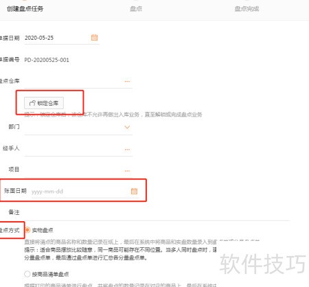 2、 所示,进入后依次点击、、,填写盘点仓库和账面日期,选择盘点方式,最后点击即可完成。