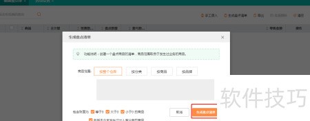 12、 进入盘点单页面,点击右上角,可按仓库、商品分类、具体商品或品牌等条件生成清单。