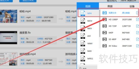 4、 打开文件后,点击输出格式,选择所需视频格式,此处以MP4为例进行转换操作。