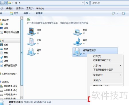2、 任意打开一个文件夹,在左侧选择库,左上角会显示新建库选项,或在文件夹空白处右键点击新建→库,即可创建新的库(图中桌面为已建好的示例)。
