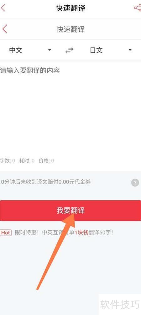 3、 进入快速翻译页面,选择中文译日文,点击我要翻译即可完成。