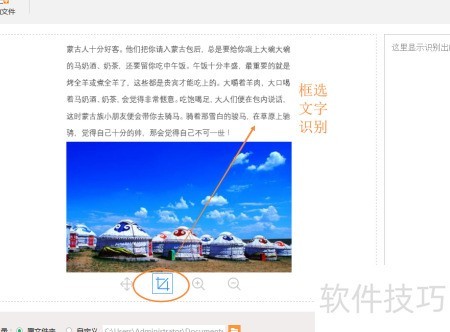 4、 使用框选识别功能,在图片上拖动鼠标划定需识别的文字区域,松开后软件将自动识别所选范围内的文字内容。