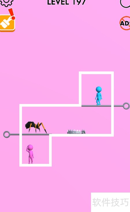 1、 本关需解救被困在底部的粉色人,其上方有毒蜘蛛,蓝色人位于捕兽夹右上方,具体布局见图示。