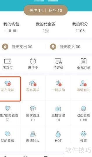 2、 进入主页,点击我的再选发布技能,即可上传服务信息。