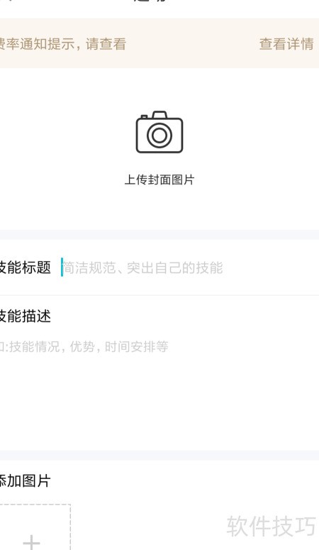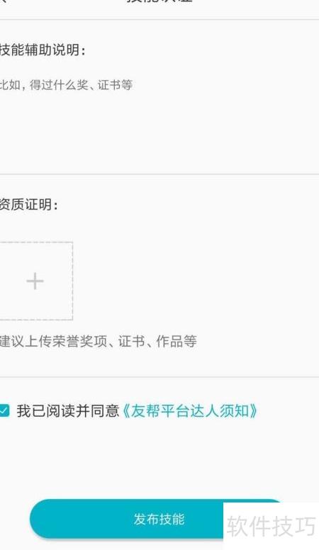 6、 完善技能描述,上传相关证书或作品,最后点击发布技能即可完成。