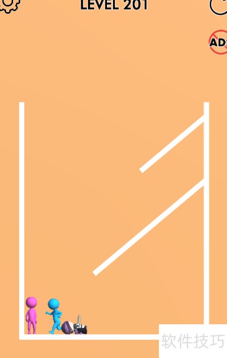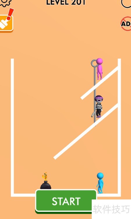 1、 本关目标为解救上方粉色人,匪徒位于其下方,地雷在蓝人左侧,需前往开启瑞坦。