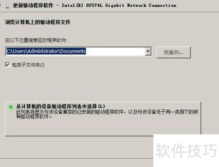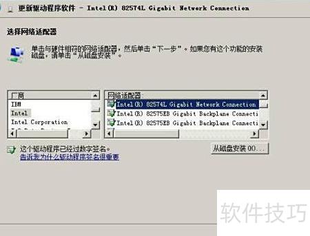 6、 在厂商选项中选择Intel,然后在网络适配器列表中选取Intel(R) 82574L...(尽管未列出I217-LM,仍请选择82574L),最后点击下一步继续操作。