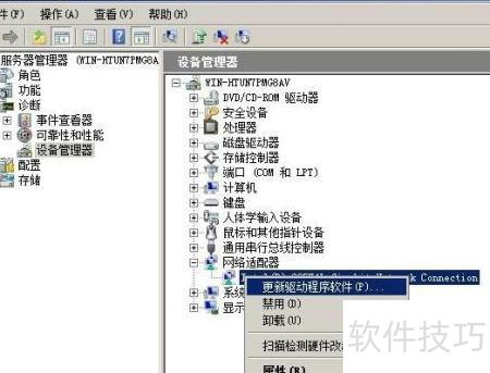 3、 打开设备管理器,右键点击网络适配器,选择更新驱动程序软件即可完成安装。