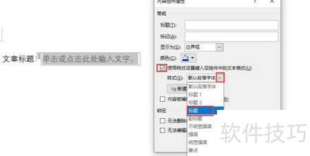 5、 勾选使用样式设置键入空控件中的文本格式,启用下方样式选项,点击下拉按钮显示样式列表,如选择标题样式。