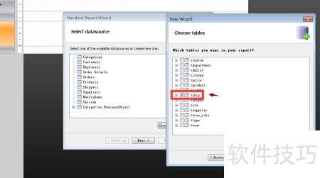 3、 选择制作单据时需要用到的表及对应字段,务必只添加实际使用的字段,避免因多余参数导致打印页面出现参数数量不匹配的问题。