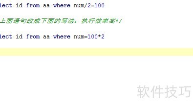 3、 在SQL的WHERE条件中对字段使用表达式操作,会使MySQL无法利用索引,从而导致全表扫描,影响查询性能。