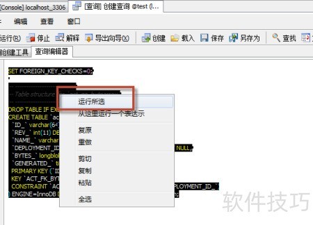 8、 选择要执行的SQL语句,可分段运行。选中某段后右键点击,选择运行所选即可。依次重复此操作,直至全部SQL代码执行完毕。