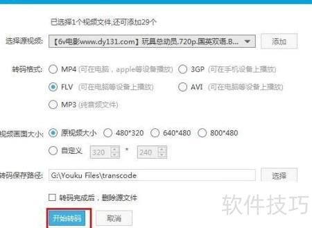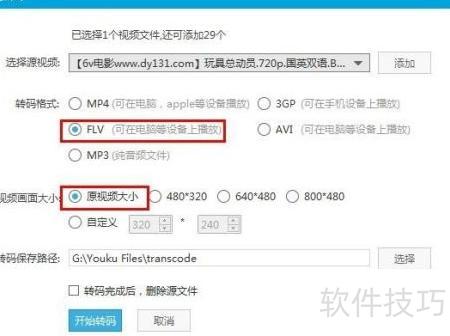 5、 选择FLV格式转码,视频尺寸保持原始大小不变。