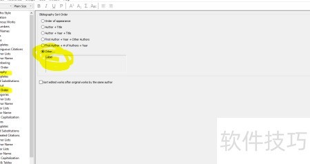 7、 在参考文献设置中找到排序选项,将排序方式更改为其他,然后选择标签作为排序依据,所示。如此操作后,导出的参考文献将按标签内容的升序进行排列。此外,也可根据需要选用其他排序关键字,灵活调整文献的显示顺序,以满足不同格式或个人偏好需求。