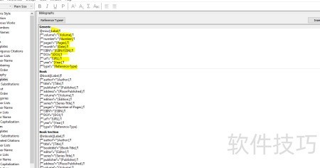 8、 我们还可以通过自定义输出格式来满足个性化需求。具体操作是在第六步的界面中,进入参考文献部分的模板设置,找到templates选项,然后对模板内容进行修改,即调整图中高亮显示的区域,从而实现格式的灵活配置与调整。