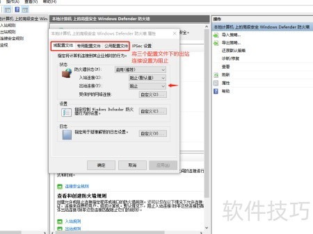 9、 根据示意图,将三个配置文件的出站连接设为阻止。