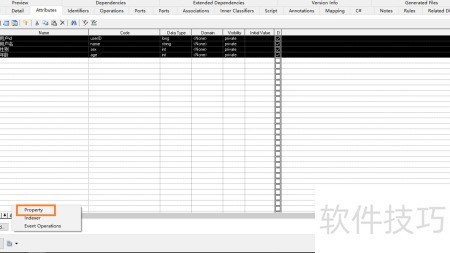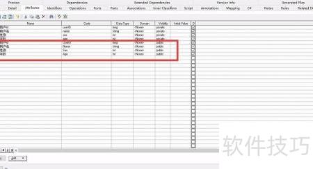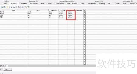 8、 进入Attribute选项卡,将其最大化后将public修改为private。此操作用于实现属性的封装,通常属性应设为私有,因此需调整为private以符合规范。