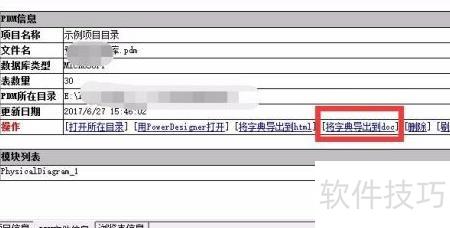 6、 点击PDM名称后,在信息中选择导出字典至DOC文档。