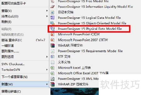 1、 安装PowerDesigner后,右键点击桌面,选择新建,然后找到并创建一个PowerDesigner 15物理模型文件即可完成操作。