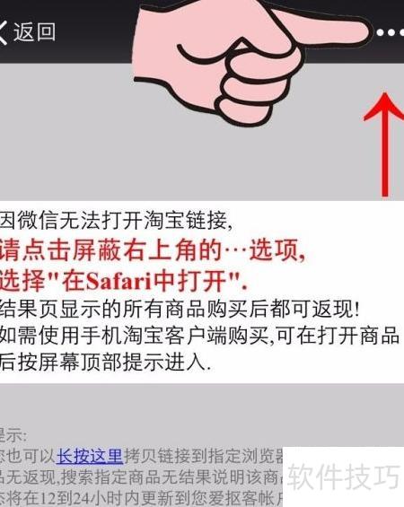 4、 当出现中转页面时,由于腾讯与淘宝之间的限制,微信内无法直接打开淘宝链接。此时请点击屏幕右上方的●●●按钮,安卓用户选择在浏览器中打开,苹果用户则选择在Safari中打开,即可顺利访问目标页面。