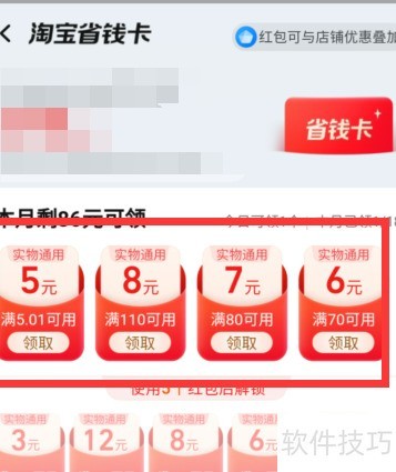 领取淘宝省钱卡红包的操作步骤如下