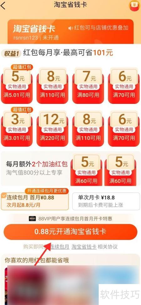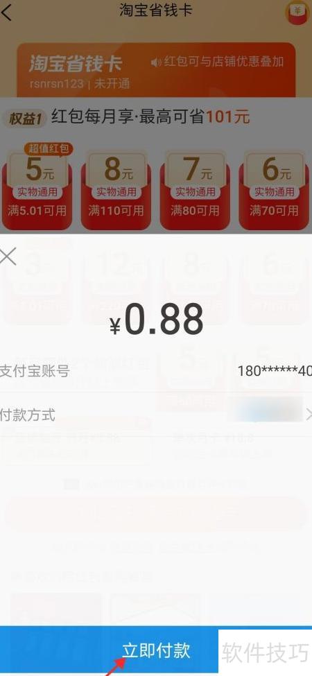 8、 点击0.88元立即开通淘宝省钱卡享优惠。